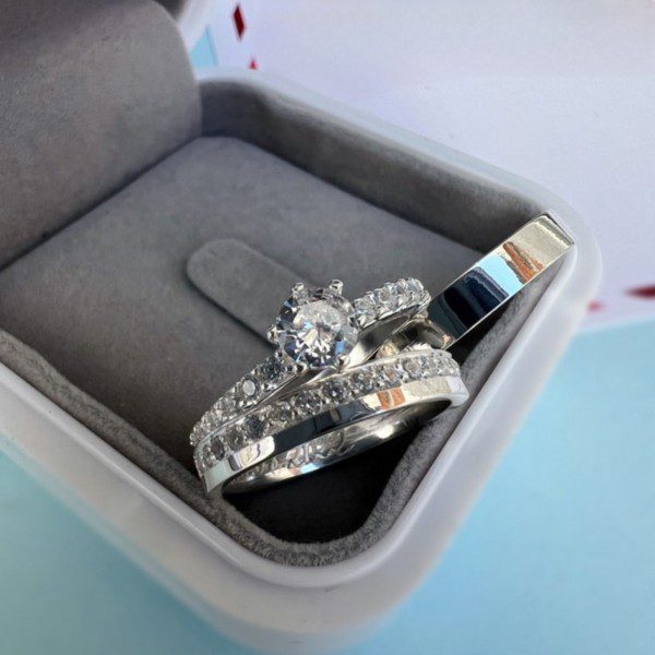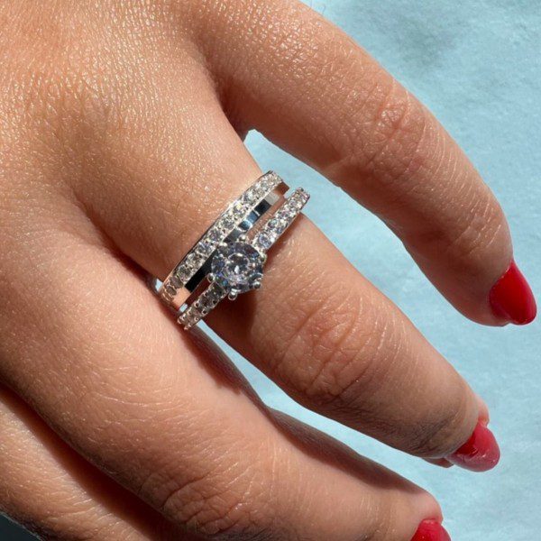 Para complementar o conjunto, há a opção de incluir um anel solitário cravejado com pedra de zircônia, agregando ainda mais brilho e sofisticação ao modelo.