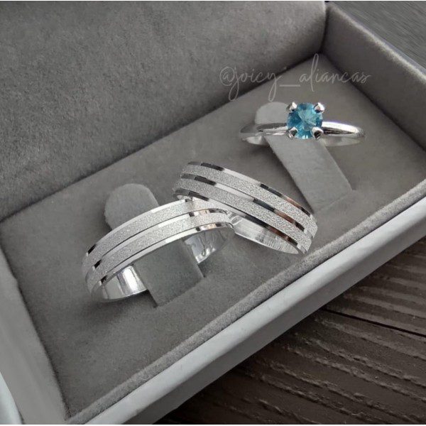 O formato semi anatômico garante um encaixe confortável no dedo, ideal para o uso diário. Para complementar o conjunto, há a opção de incluir um anel solitário opcional cravejado com pedra de zircônia azul, agregando ainda mais charme e sofisticação ao modelo.