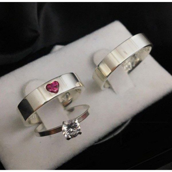 O modelo feminino se destaca por conter uma pedra de zircônia em formato de coração na cor vermelha, adicionando um toque romântico e delicado à peça. Já o modelo masculino mantém o acabamento liso e polido, garantindo um visual discreto e elegante.