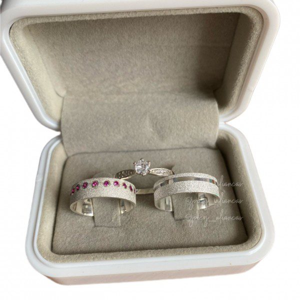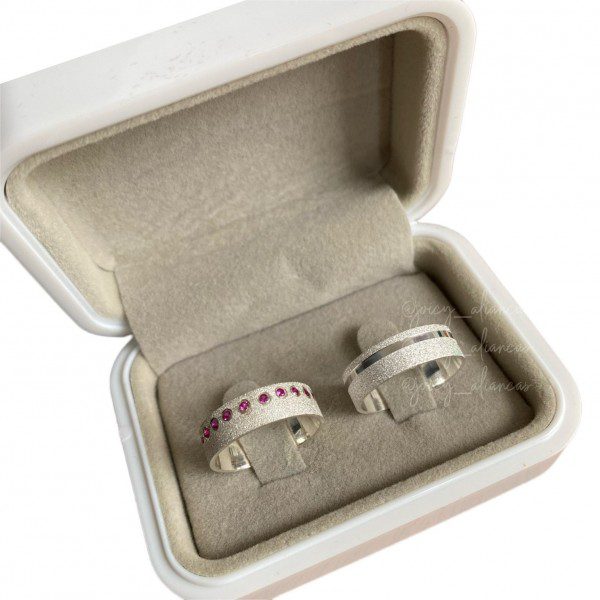 A aliança feminina se destaca pelas 15 pedras de zircônia rosa (meia volta), proporcionando brilho e um toque romântico à peça. O modelo masculino mantém o acabamento diamantado e conta com 1 friso lateral, conferindo um design equilibrado e sofisticado.