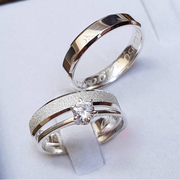 A aliança feminina possui um acabamento diamantado, garantindo um brilho delicado e sofisticado. Já o modelo masculino mantém um design liso e polido, oferecendo um visual clássico e discreto. Para quem deseja um toque especial, há a opção de adicionar um anel solitário cravejado com pedra de zircônia, agregando ainda mais requinte ao conjunto.