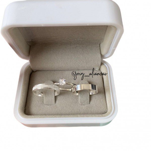 A aliança feminina se destaca por seu friso diamantado com lateral baixa, proporcionando um efeito delicado e refinado. Já a aliança masculina mantém um design liso e polido, garantindo um visual clássico e atemporal. Para complementar o conjunto, há a opção de adicionar um anel solitário cravejado com pedra de zircônia, agregando um toque extra de brilho e sofisticação.