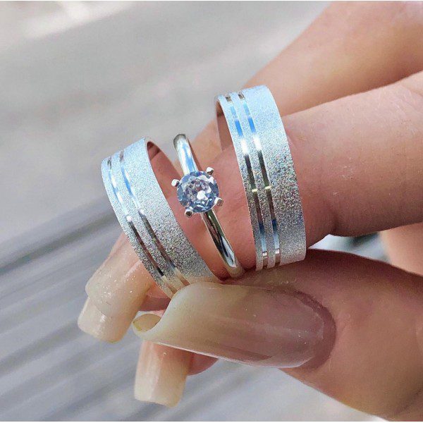 Alianças de Namoro em Prata 950 | Modelo Polly | 6mm Diamantado com 2 Frisos Laterais | Reto Semi Anatômico | Anel Solitário Opcional