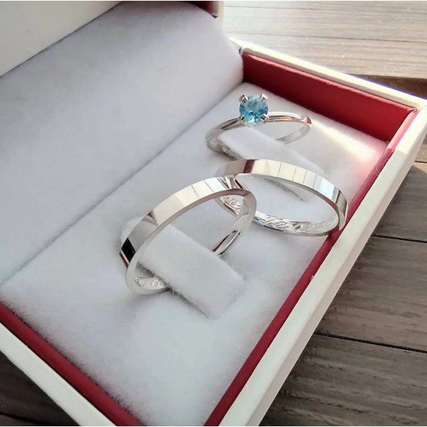 Alianças de Namoro em Prata 950 | Modelo Yasmin | 3mm Reto Anatômico | Modelo Liso | Anel Solitário Pedra Azul Opcional
