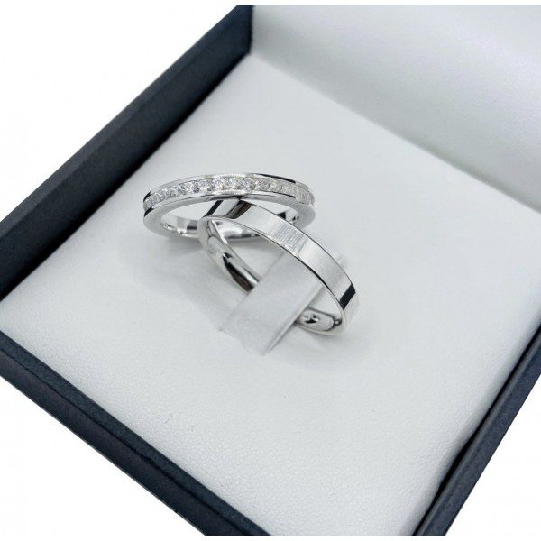 A aliança feminina se destaca com 15 pedras de zircônia cravejadas em meia volta, proporcionando brilho e delicadeza. Já a aliança masculina mantém um visual clássico e sofisticado, sendo lisa e polida, oferecendo um design equilibrado para o casal.