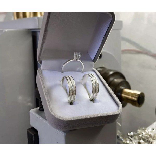 Esse modelo é ideal para casais que buscam alianças sofisticadas e modernas, com um design elegante e a opção de complementar o conjunto com um anel solitário.