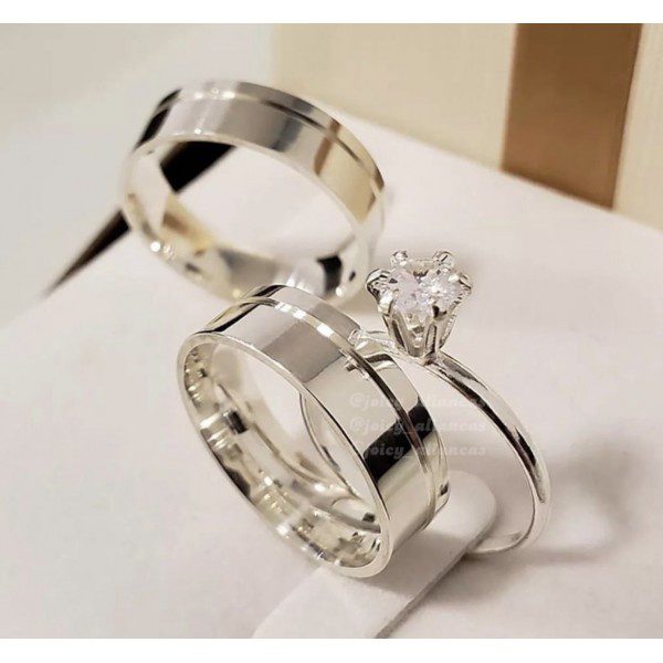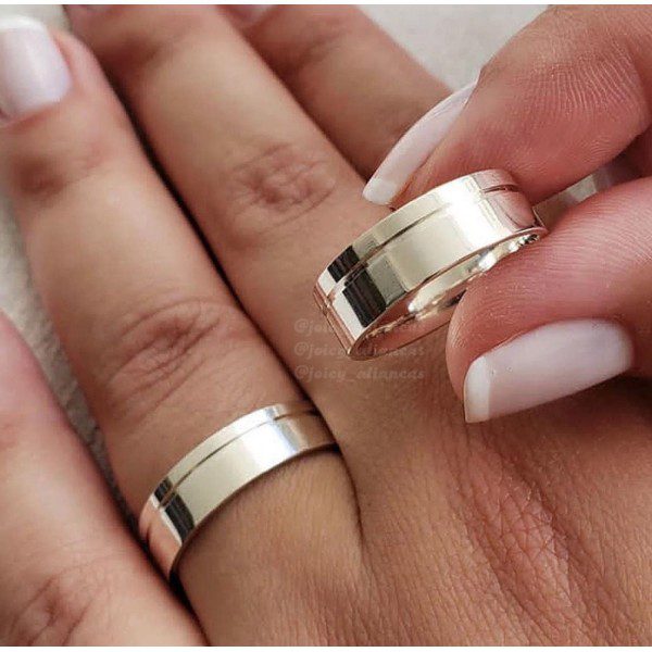 Alianças de Namoro em Prata 950 | Modelo 7mm Liso Polido com 1 Friso Lateral | Semi Anatômico | Anel Solitário Incluso
