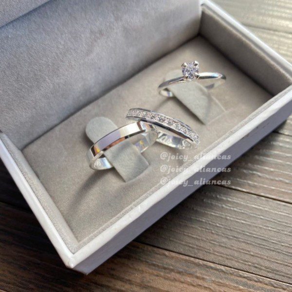 A aliança feminina se destaca com 15 pedras de zircônia cravejadas em meia volta, proporcionando um brilho delicado e refinado. Já a aliança masculina mantém um estilo liso chanfrado, garantindo um visual equilibrado e sofisticado. Para complementar o conjunto, há a opção de um anel solitário cravejado com pedra de zircônia, tornando o modelo ainda mais especial.
