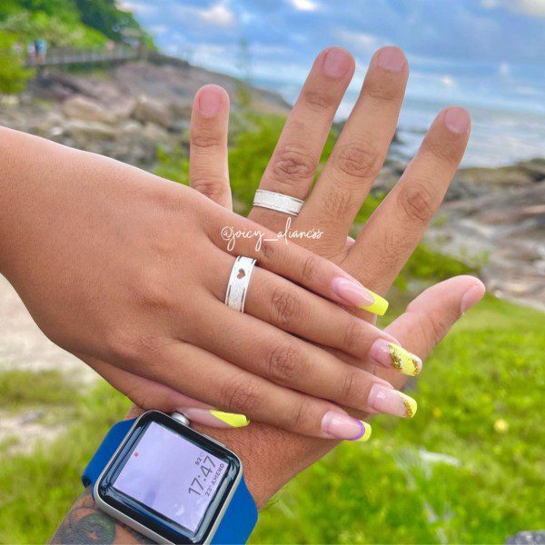 O modelo feminino se destaca pelo coração vazado no centro, simbolizando o amor e a conexão do casal, além dos 2 frisos em cada lado, realçando ainda mais a delicadeza da peça. Já o modelo masculino mantém o acabamento diamantado com 2 frisos laterais, garantindo um visual sofisticado e harmonioso.