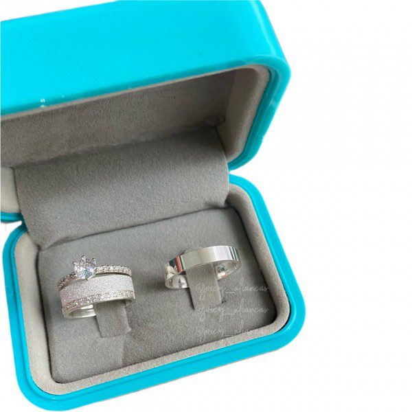 O modelo feminino, com 4mm de largura, possui acabamento diamantado, realçando seu brilho e delicadeza. O modelo masculino, também com 4mm de largura, segue um design liso, garantindo equilíbrio e sofisticação ao conjunto.