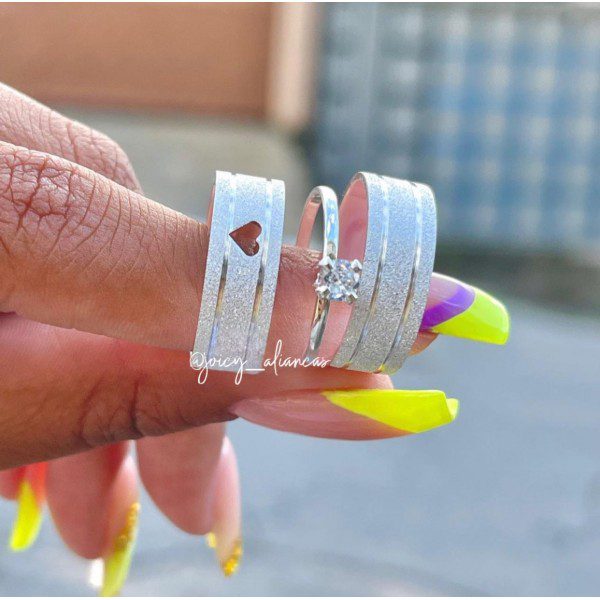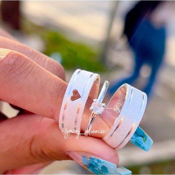 O modelo feminino se destaca pelo coração vazado no centro, um detalhe delicado que simboliza o amor e a conexão do casal. Já o modelo masculino segue o mesmo acabamento diamantado com dois frisos laterais, garantindo harmonia no conjunto. Além disso, esse conjunto acompanha um anel solitário incluso, cravejado com pedra de zircônia, trazendo ainda mais sofisticação.