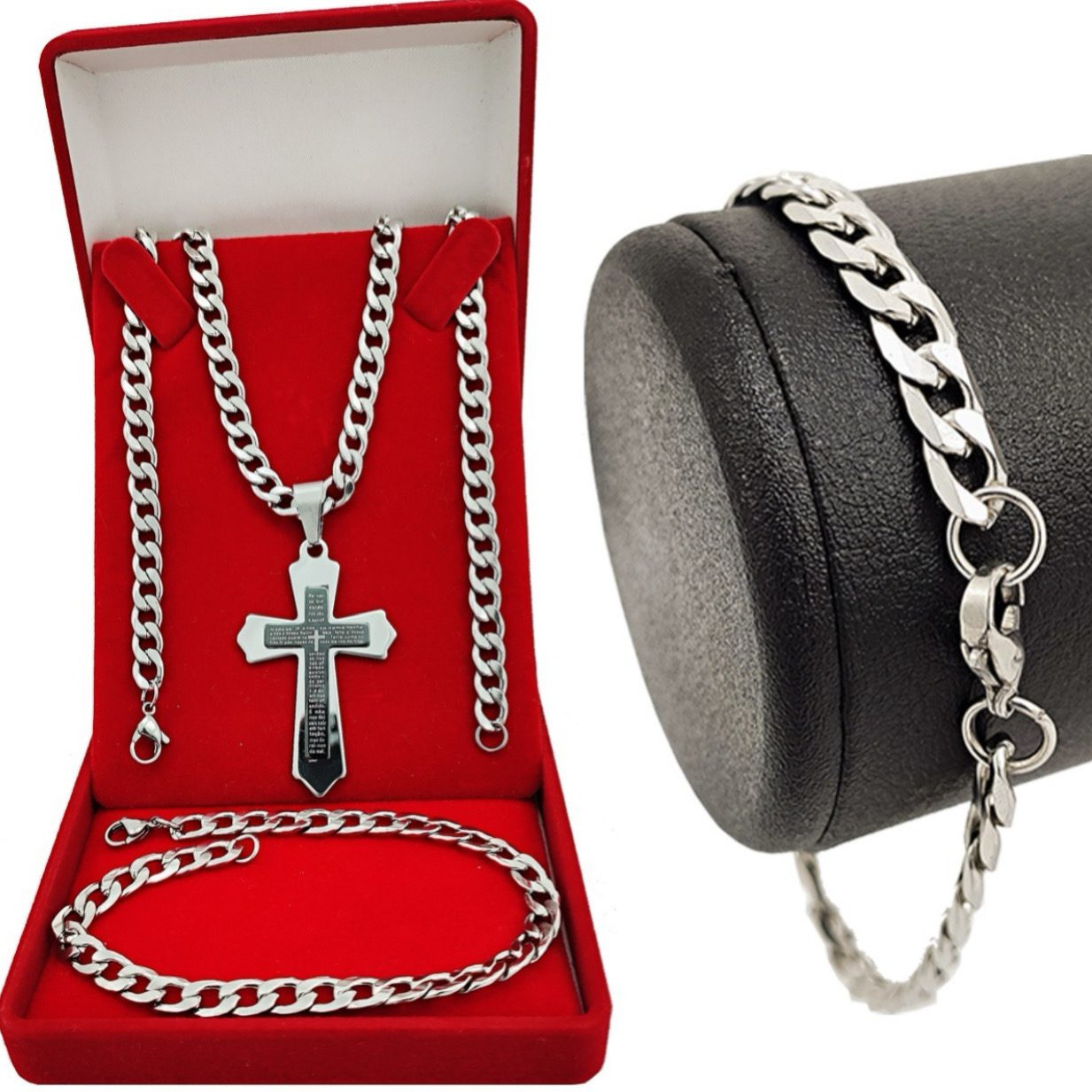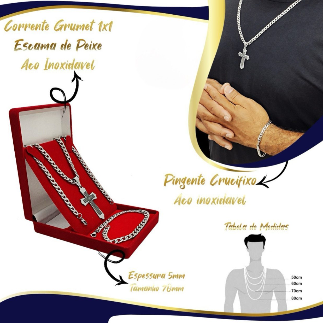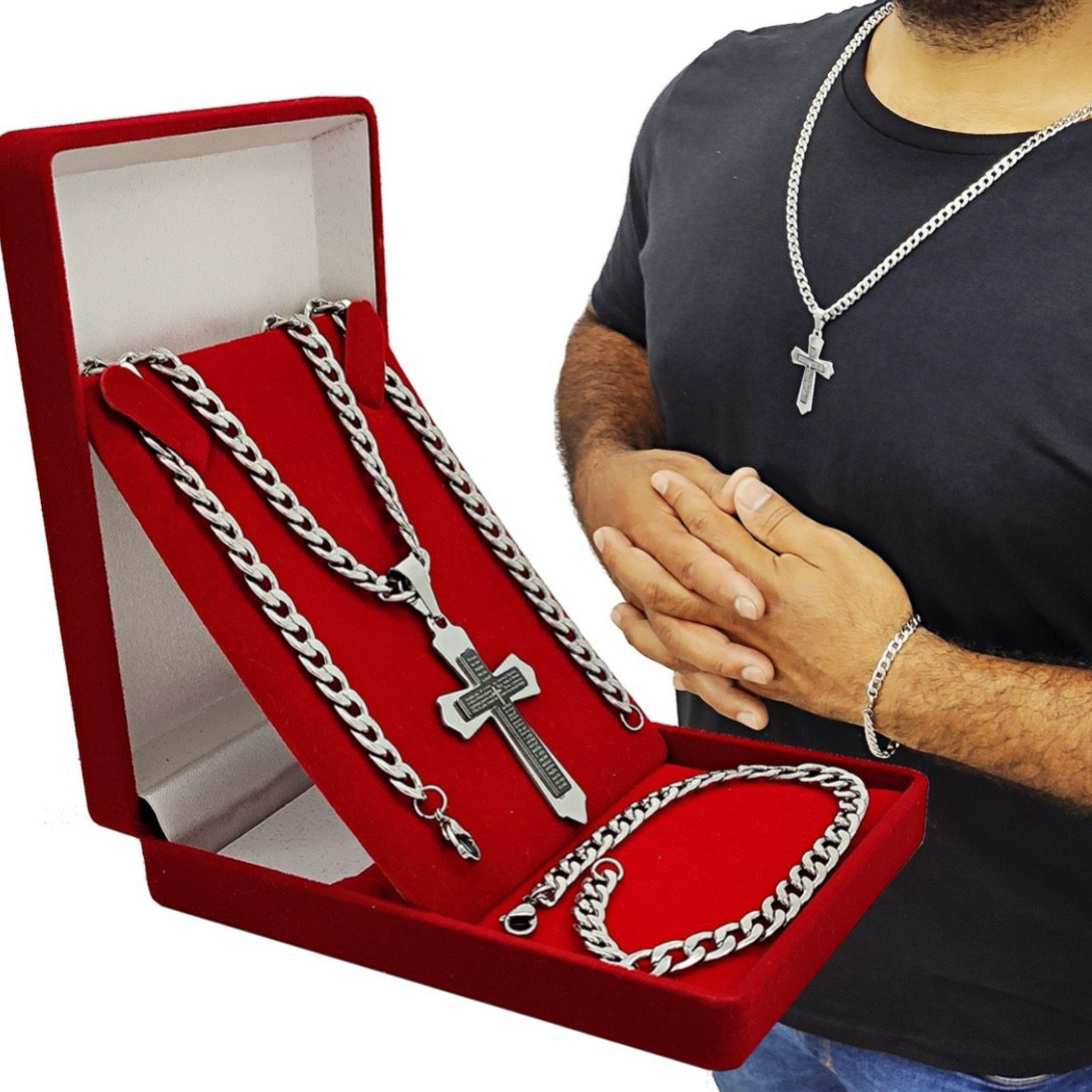Corrente Colar Masculina Prata De Aço + Pulseira + Pingente Cruz