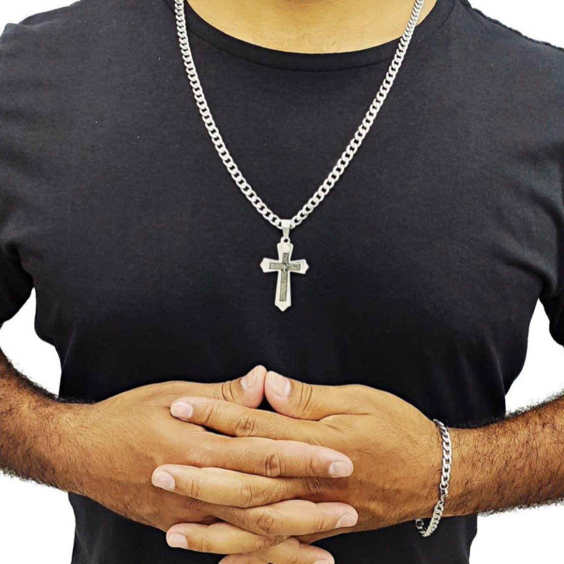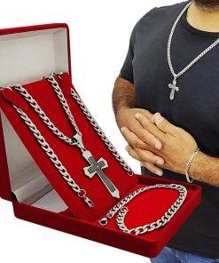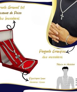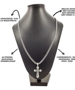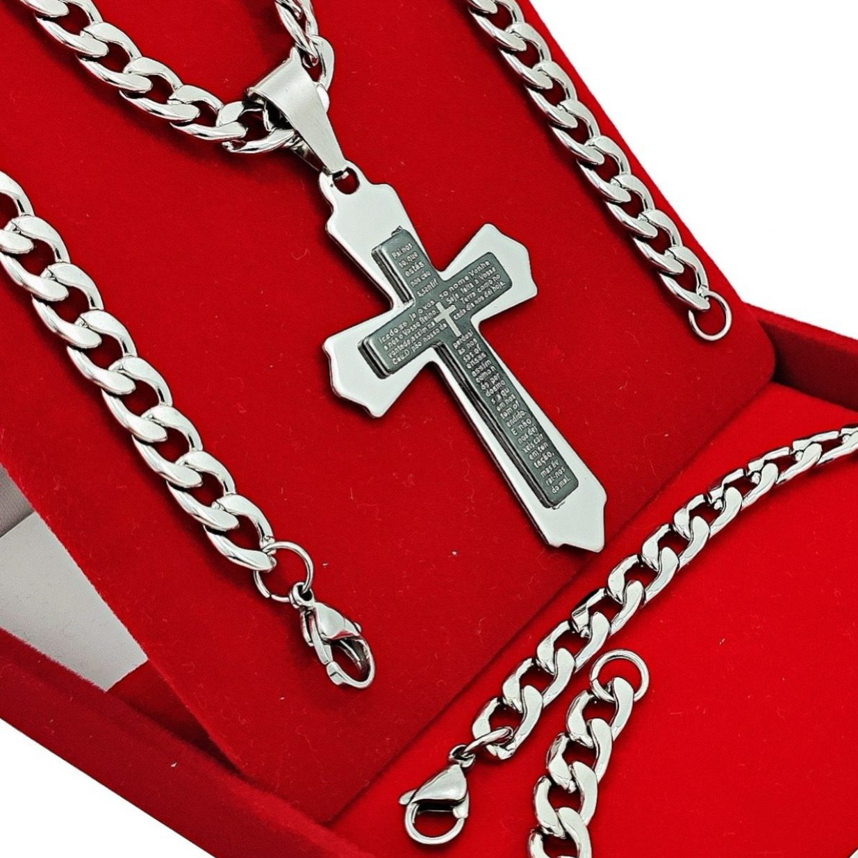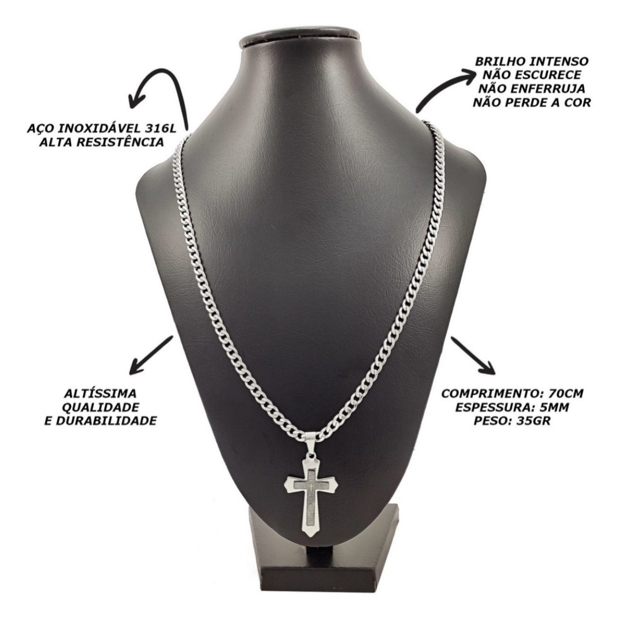 Corrente Colar Masculina Prata De Aço + Pulseira + Pingente Cruz