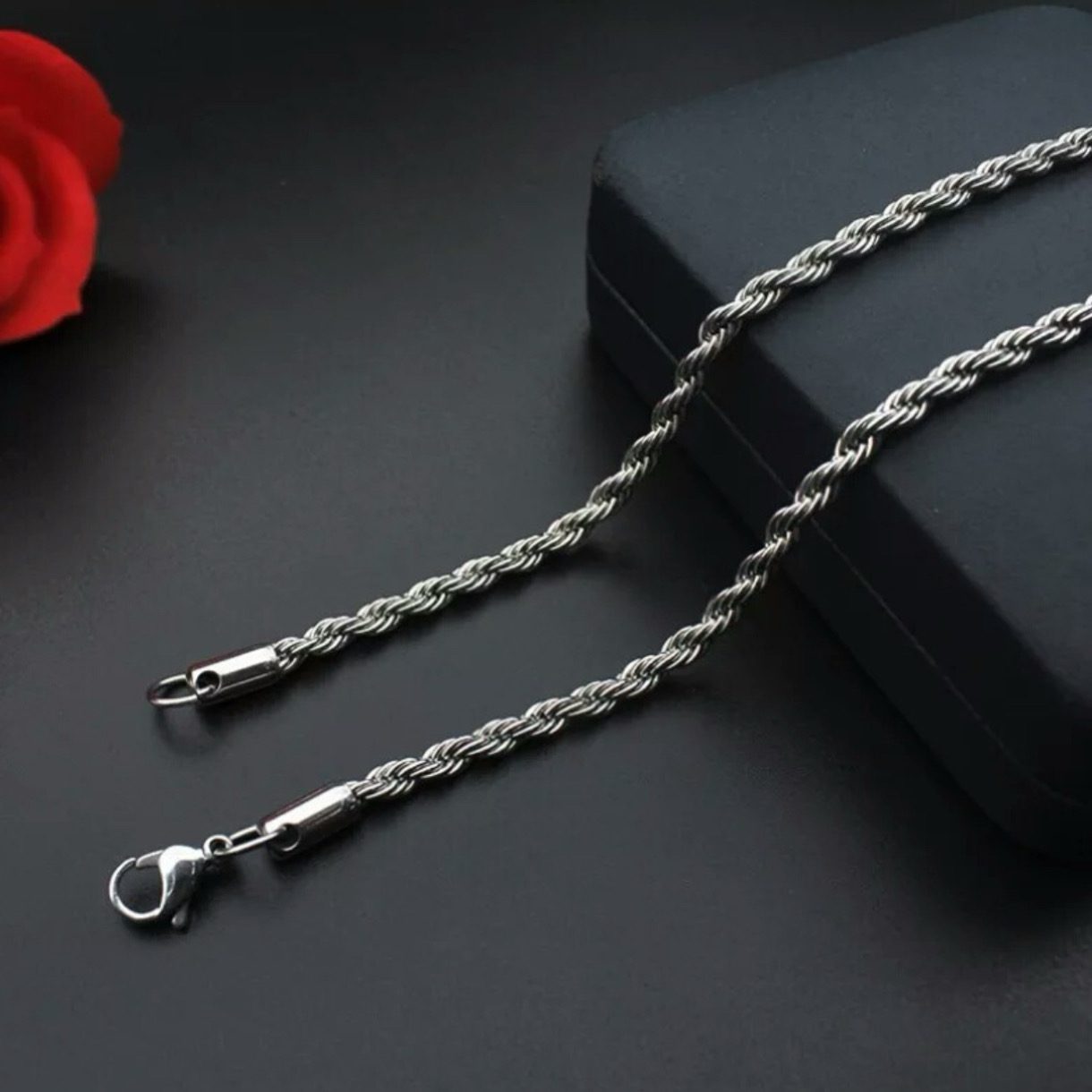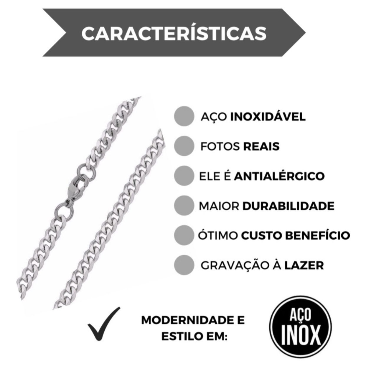 Não enferruja e não deixa a pele verde, possuí grande durabilidade.