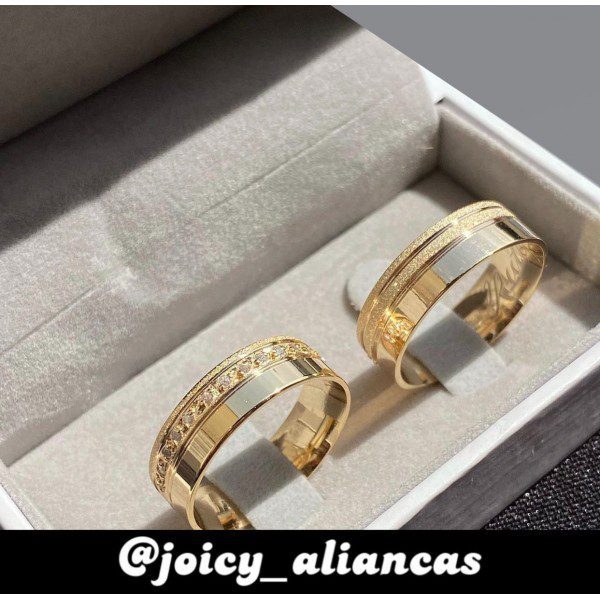 • Par de alianças 6mm (feminina com pedras de zircônia, masculina com design liso).