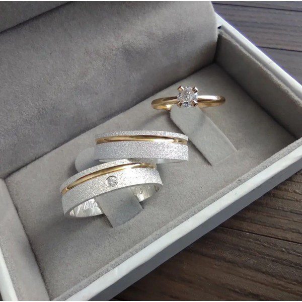 Para tornar esse conjunto ainda mais especial, acompanha um anel solitário banhado a ouro 18K incluso, que complementa perfeitamente a sofisticação das alianças.
