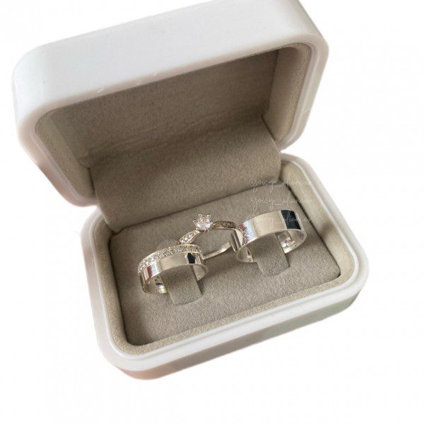 A aliança feminina se destaca pelo seu acabamento com 15 pedras de zircônia laterais, criando um brilho delicado e refinado. Já a aliança masculina mantém um estilo liso e polido, garantindo um visual moderno e equilibrado.