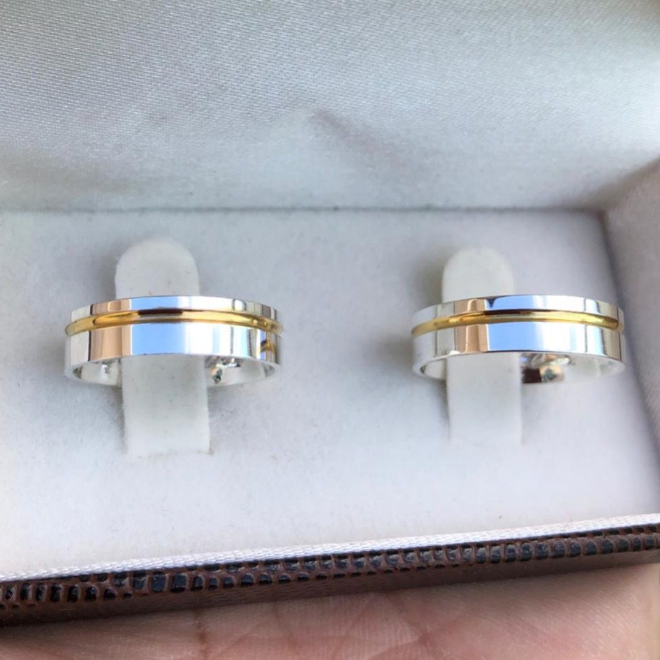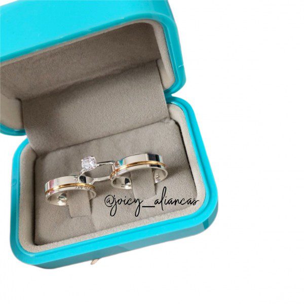 Alianças de Namoro Prata 950 – Modelo Nataly – Friso Lateral com Filete Banhado a Ouro 18K – Largura 6mm – Anel Solitário Opcional