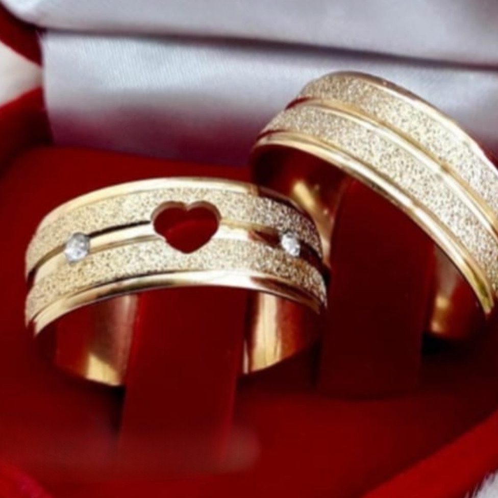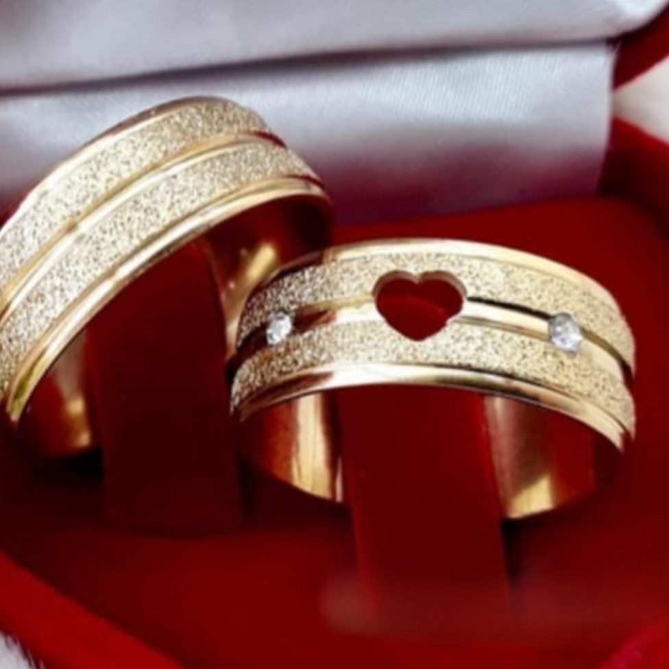 Par de alianças aço cirúrgico banhado a ouro 18k- 8mm- diamantado. com pedrinha e coração vazado. – Ideal para casamento e noivado.