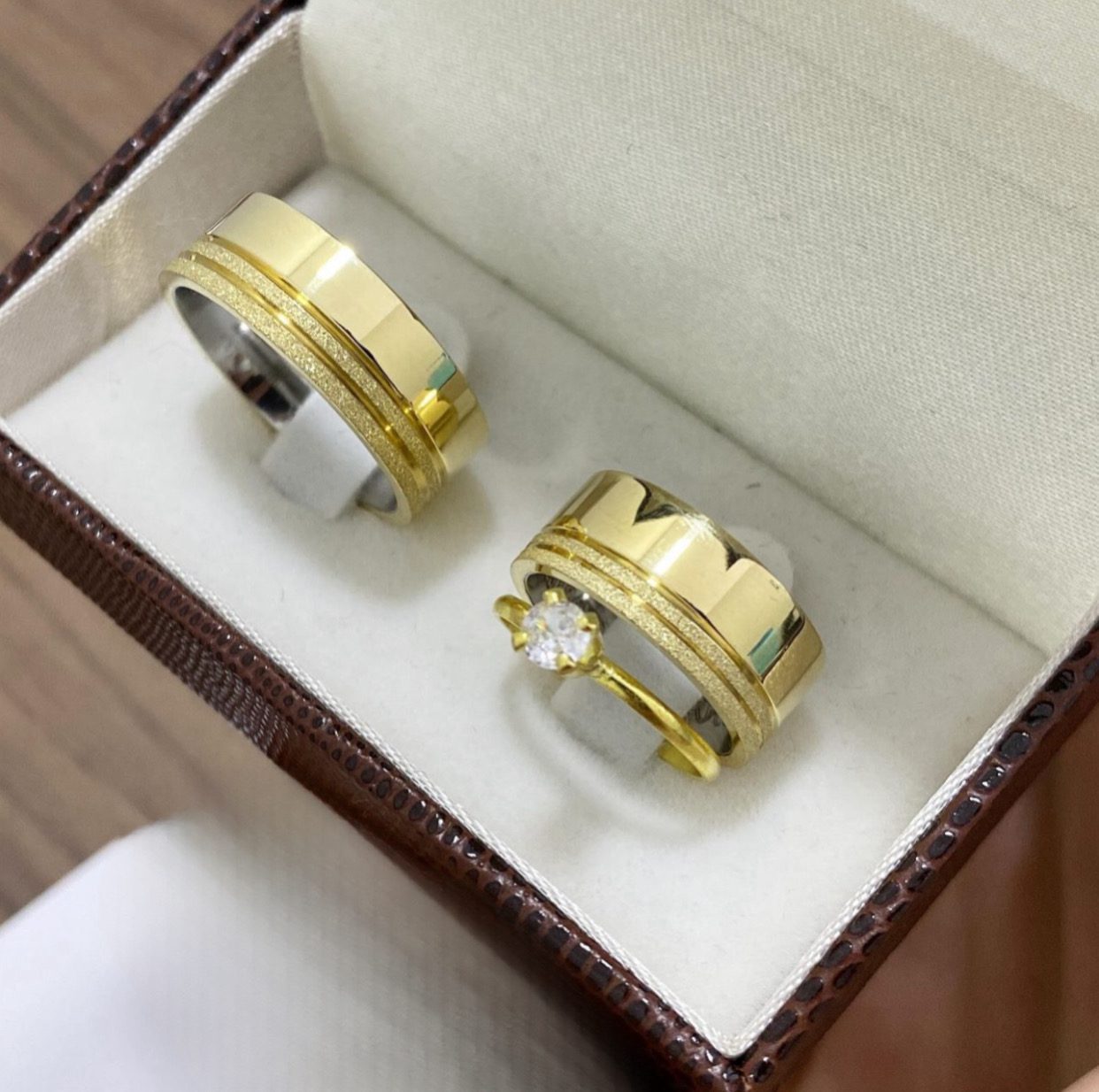 • Par de alianças em Ouro 10K com revestimento em aço