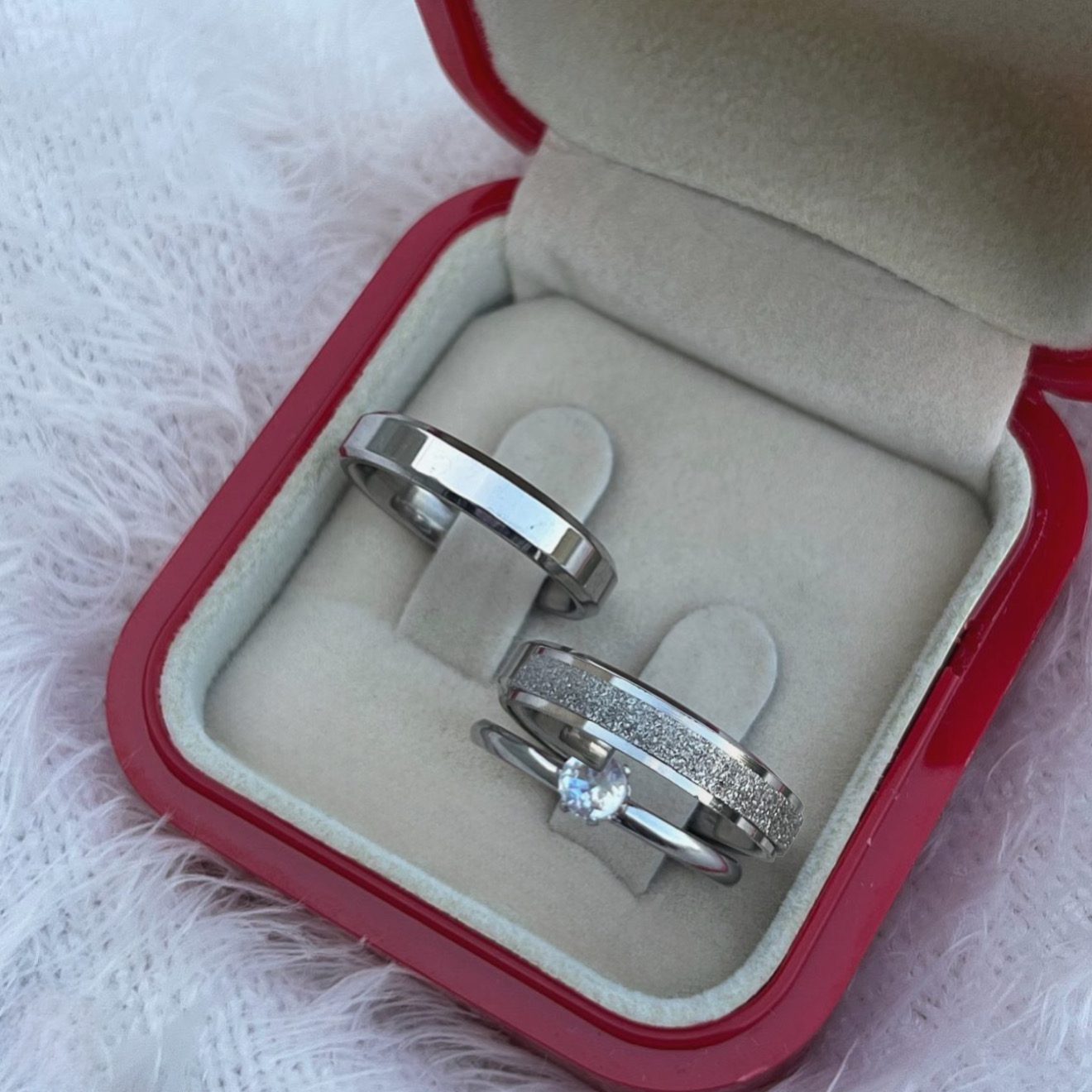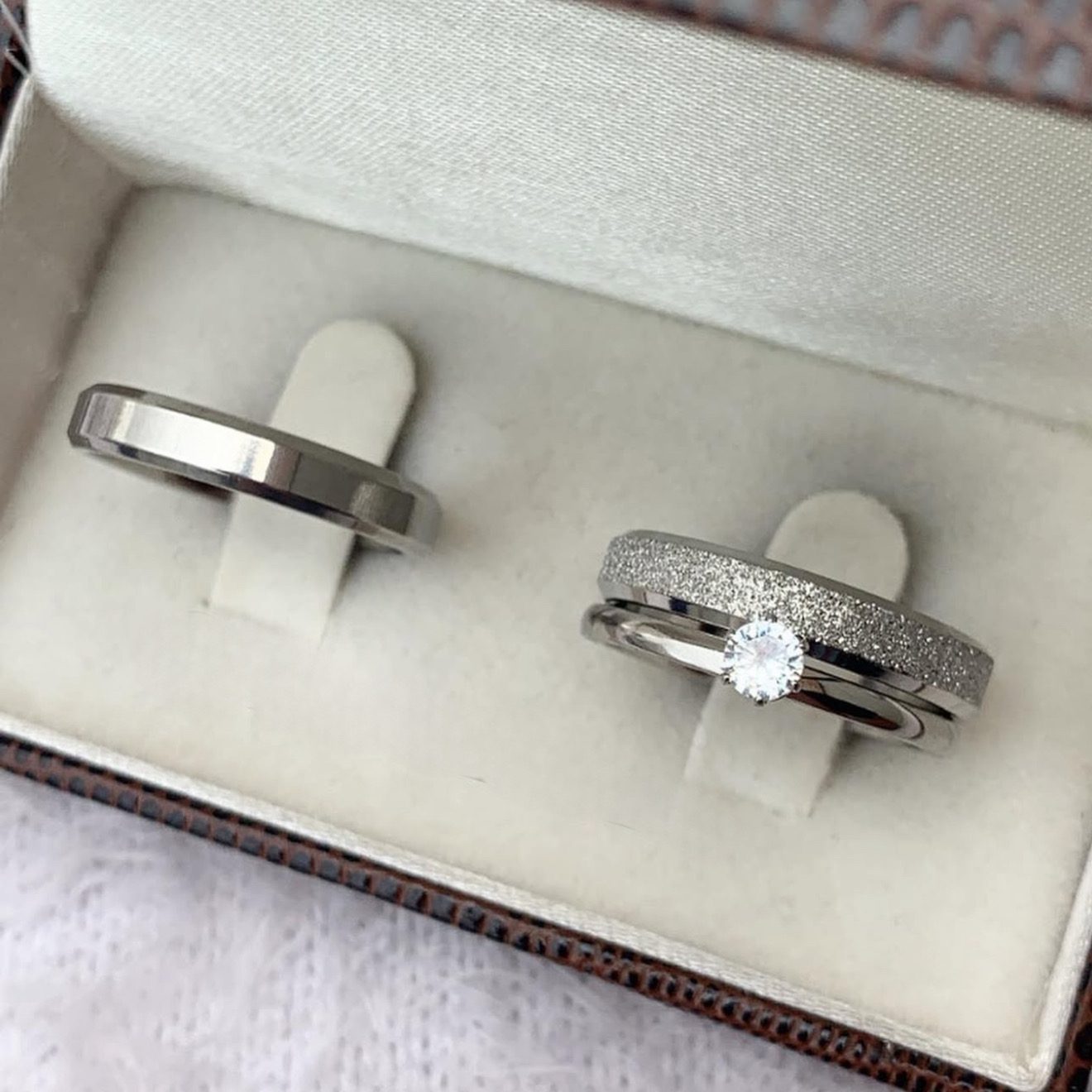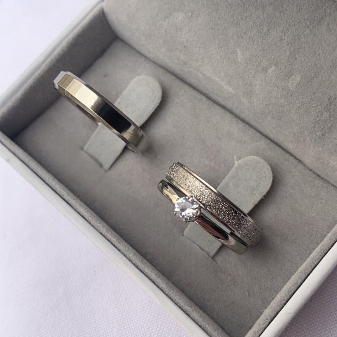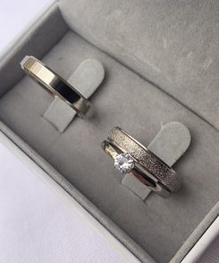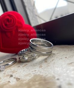 ● Par de alianças prata em aço cirúrgico 4mm (feminina diamantada com friso e masculina lisa chanfrada).