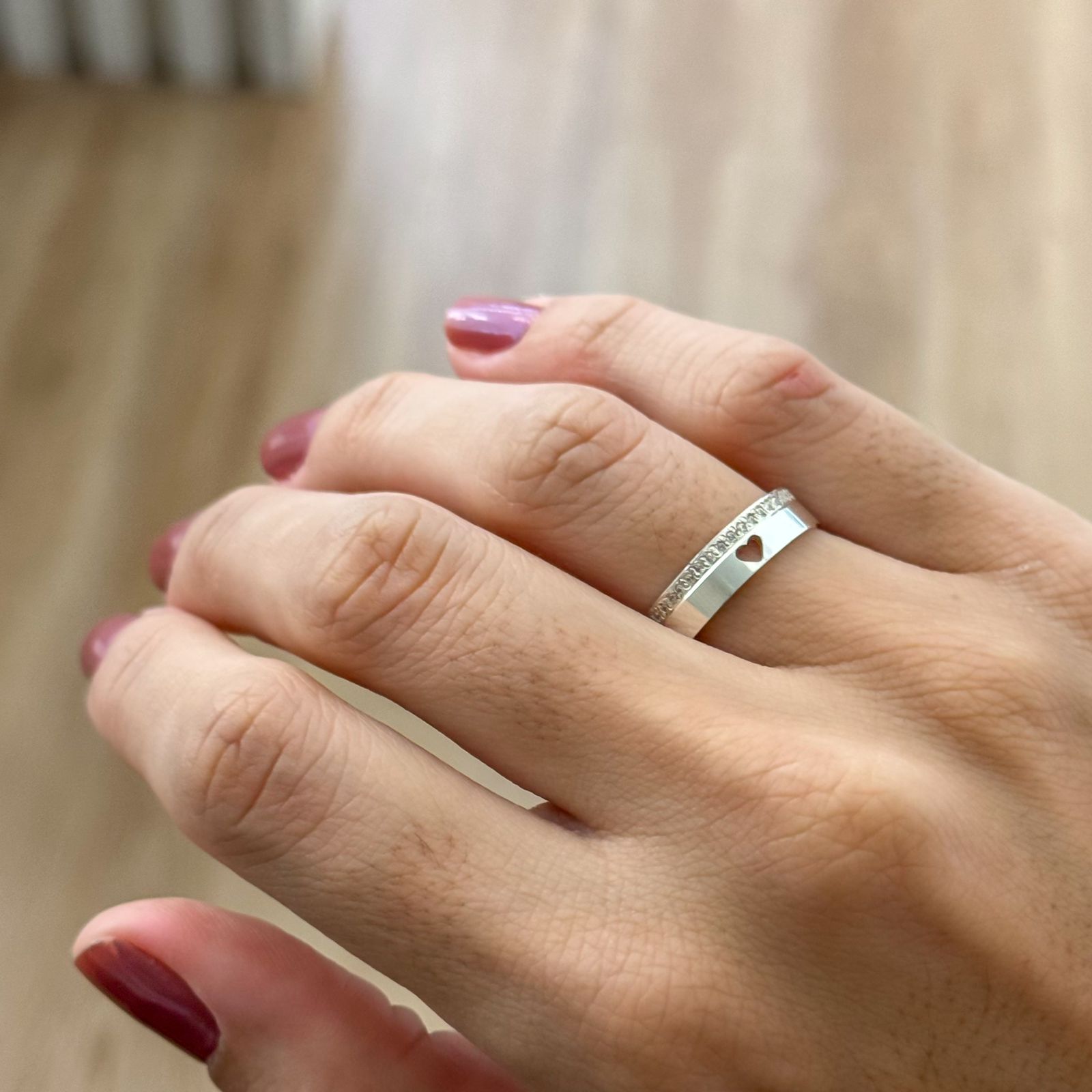 • Detalhes Especiais: Aliança feminina com 15 pedras de zircônia laterais e coração vazado, agregando brilho e romantismo.