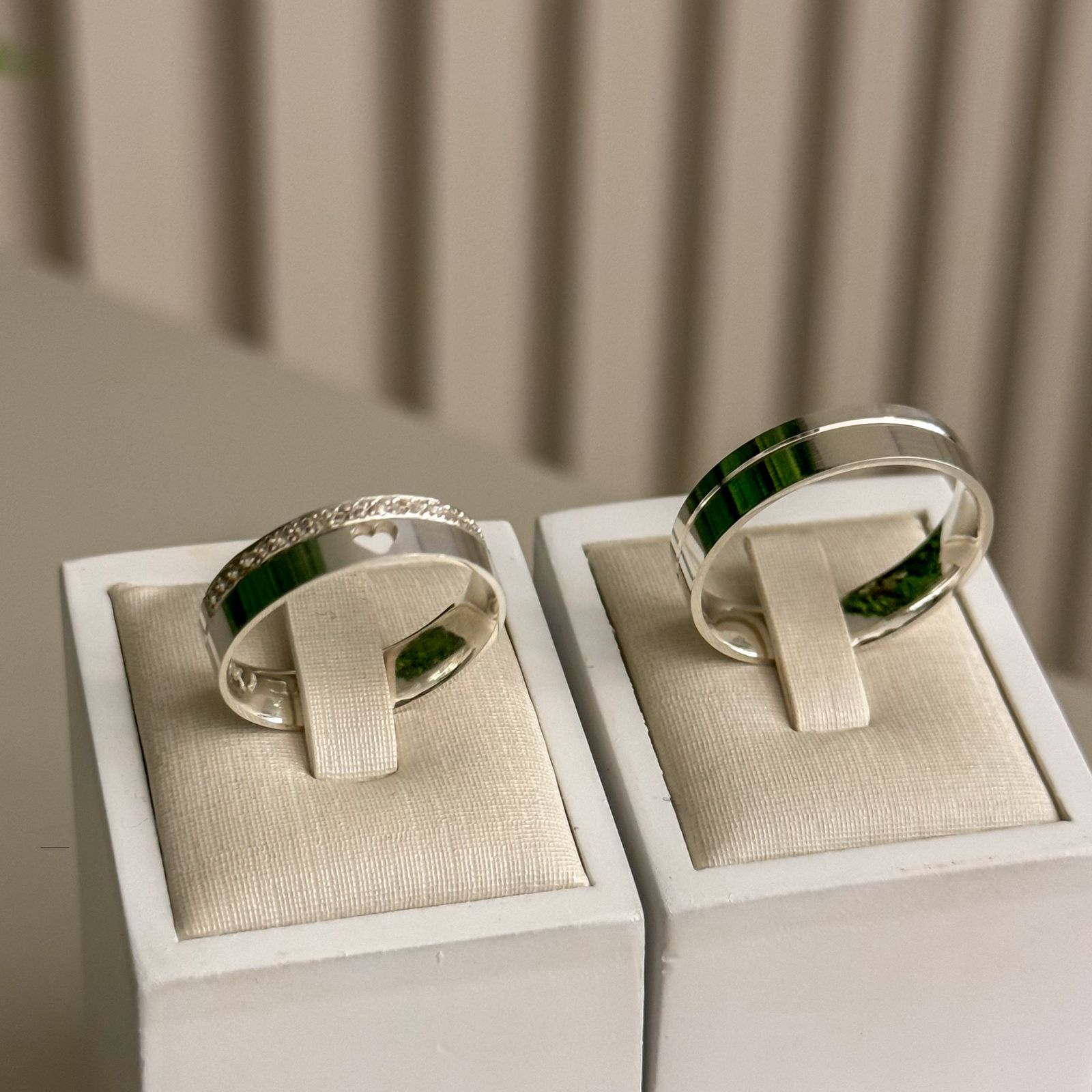 A aliança feminina se destaca pelo coração vazado no centro e pelo brilho delicado de 15 pedras de zircônia cravadas na lateral, conferindo um toque romântico e sofisticado. Já a aliança masculina mantém um visual liso e polido, com 1 friso lateral, agregando modernidade ao conjunto.