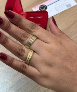 Este par de alianças é uma verdadeira expressão de sofisticação, confeccionado com moedas antigas e banhado a ouro 18k, oferecendo uma estética refinada e durável. Com 4mm de largura e design chanfrado, as alianças possuem um acabamento perfeito, ideal para casais que buscam um modelo exclusivo e resistente. O design semi anatômico garante conforto para o uso contínuo.