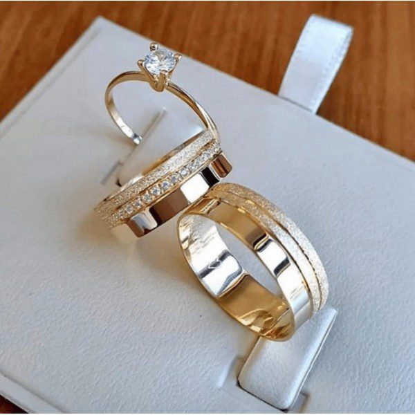 • 2 frisos laterais diamantados em ambas as alianças, proporcionando um acabamento sofisticado.