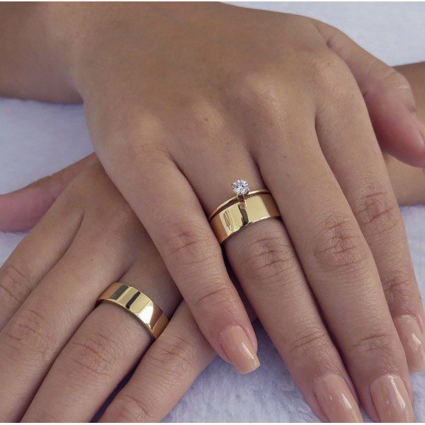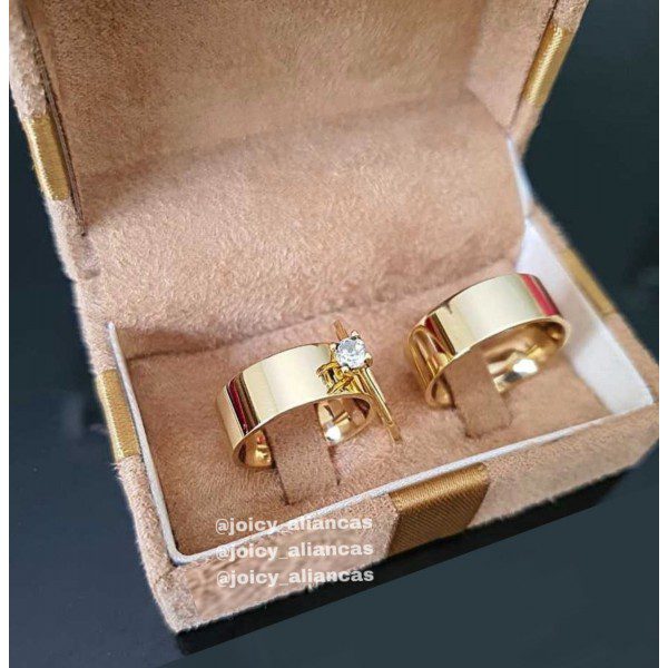 O Par de Alianças Modelo Alice combina elegância e durabilidade, sendo a escolha perfeita para casais que buscam sofisticação. Com 8mm de largura, as alianças são feitas em moeda antiga, banhadas a ouro 18k, e apresentam um acabamento semi anatômico que garante conforto durante o uso diário. O anel solitário é opcional, permitindo personalizar ainda mais o conjunto com um toque extra de brilho.