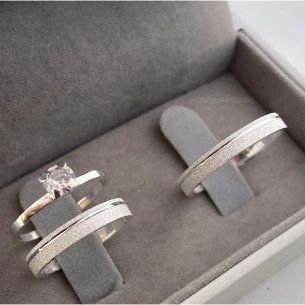Alianças de Namoro em Prata 950 | Modelo Clara | 3mm Diamantado com 1 Friso Lateral | Anel Solitário Incluso
