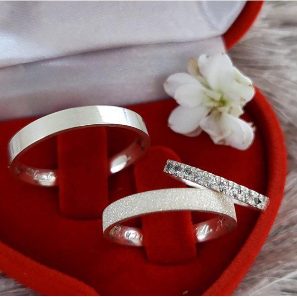 Alianças de Namoro em Prata 950 | Modelo Guta | 4mm Reto Semi Anatômico | Feminina Diamantada | Masculina Lisa | Aparador Incluso