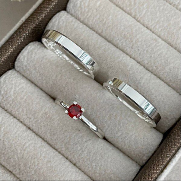 Esse modelo é ideal para casais que desejam alianças finas e elegantes com acabamento chanfrado, acompanhadas de um lindo anel solitário com pedra vermelha.
