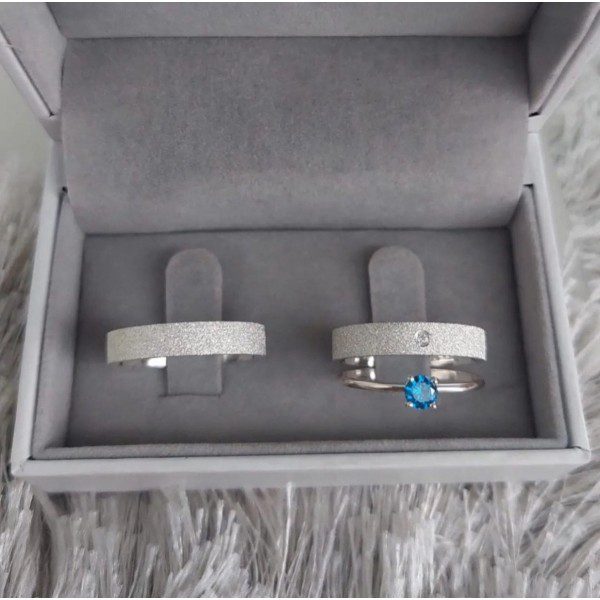 Este conjunto é perfeito para casais que desejam alianças sofisticadas e modernas, com o toque especial de um anel solitário com pedra azul para eternizar o momento!