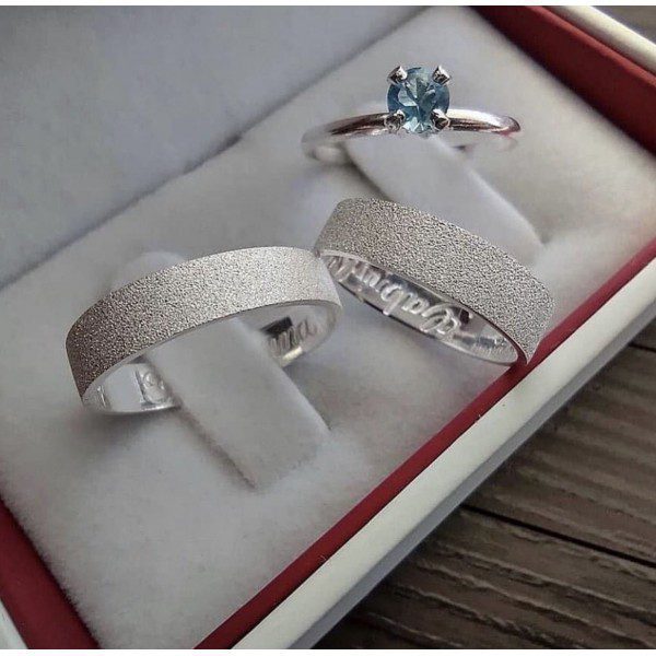 A aliança feminina se destaca pelo acabamento diamantado, garantindo um brilho especial e único. A aliança masculinasegue com o mesmo acabamento, mantendo a harmonia e imponência do conjunto. Para deixar essa experiência ainda mais especial, um anel solitário com pedra de zircônia azul está incluso, proporcionando um toque extra de sofisticação.