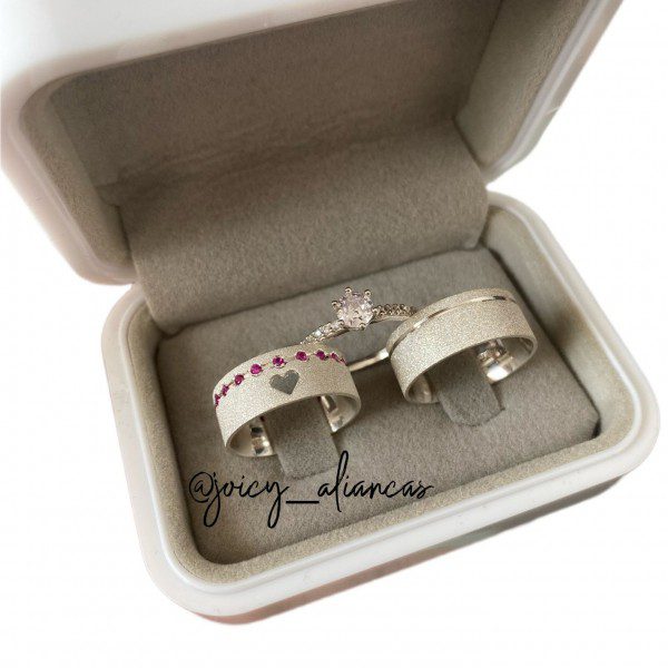 A aliança feminina se destaca por sua delicadeza e requinte, possuindo 10 pedras de zircônia na cor vinho, distribuídas ao longo da peça, além de um coração vazado, que simboliza o amor e a união do casal. Já a aliança masculina mantém a sofisticação com um acabamento diamantado e um friso lateral, garantindo um visual equilibrado e sofisticado.