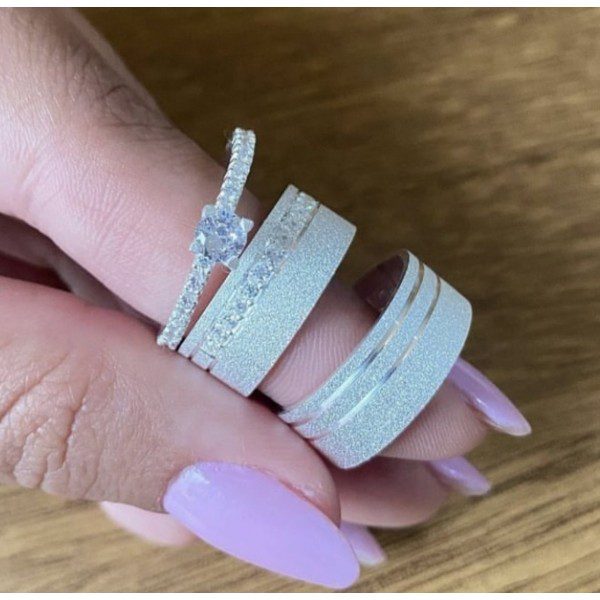 Para complementar esse conjunto especial, um anel solitário cravejado com pedra de zircônia está incluso, agregando ainda mais brilho e exclusividade ao par de alianças.
