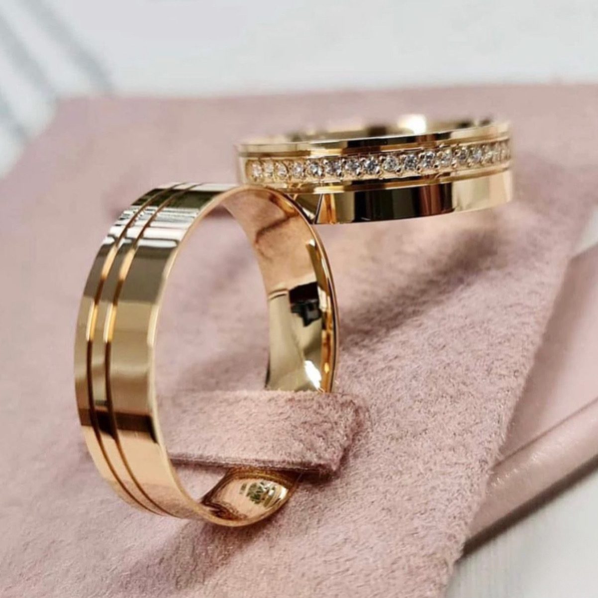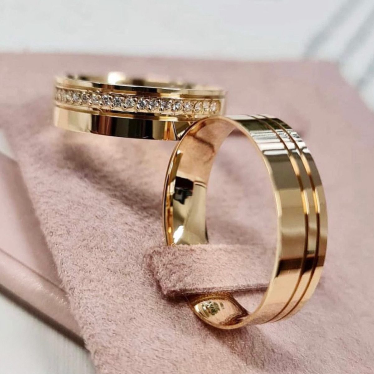 Alianças de Casamento 6mm | Modelo Juliette | Feminina com 15 Pedras de Zircônia Laterais | Masculina Lisa com 2 Frisos Laterais