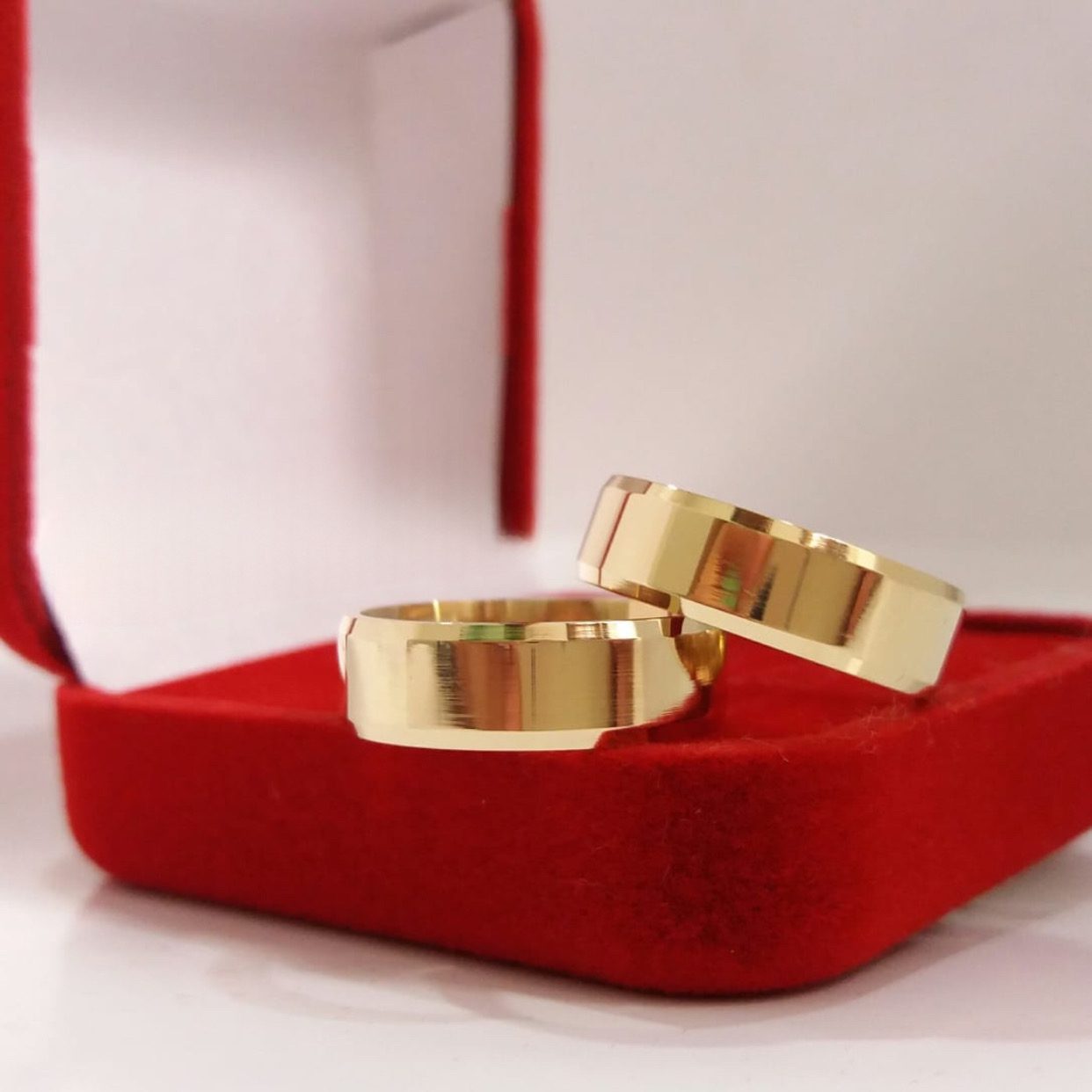 • Par de alianças chanfradas de 6mm, banhado a ouro 18k.