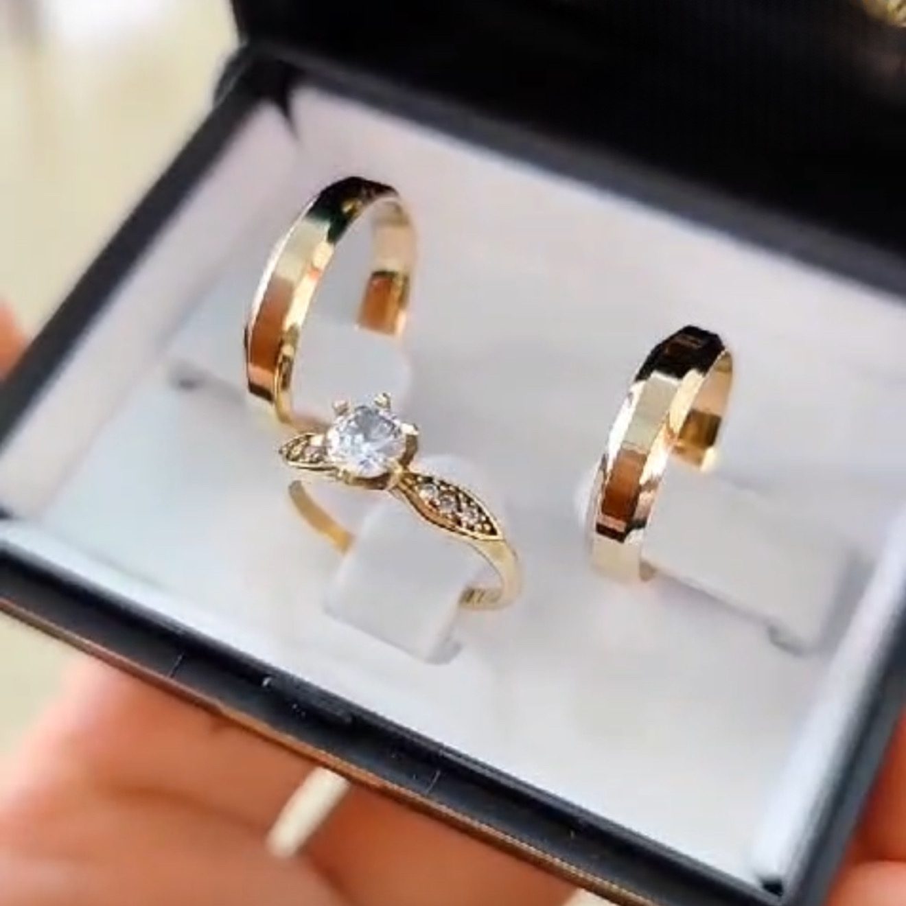 • Par de alianças modelo Roma (chanfrado, semi anatômico, banhado a ouro 18k).