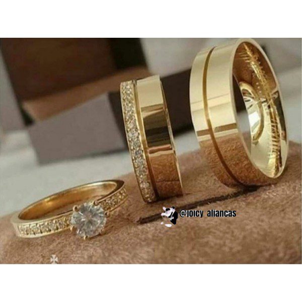 • Par de alianças modelo Sandra (feminina com 15 pedras e masculina com design clássico).