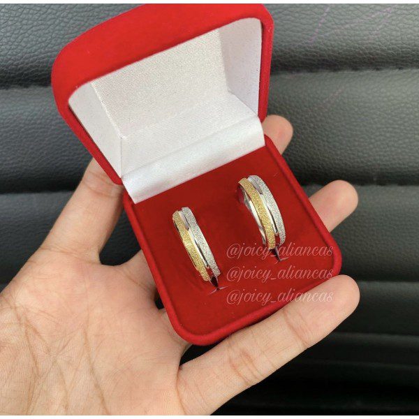 Par de alianças prata em aço cirúrgico 6mm dourado e prata com friso – Ideal para namoro, noivado e compromisso.
