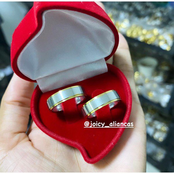 Par de alianças prata em aço cirúrgico 6mm prata e dourado liso – Ideal para namoro, noivado e compromisso.