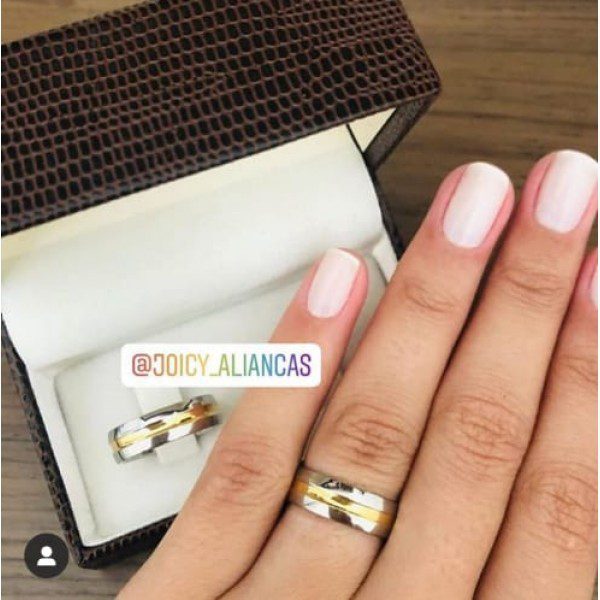 Par de alianças prata em aço cirúrgico 6mm tradicional com friso dourado – Ideal para namoro, noivado e compromisso.
