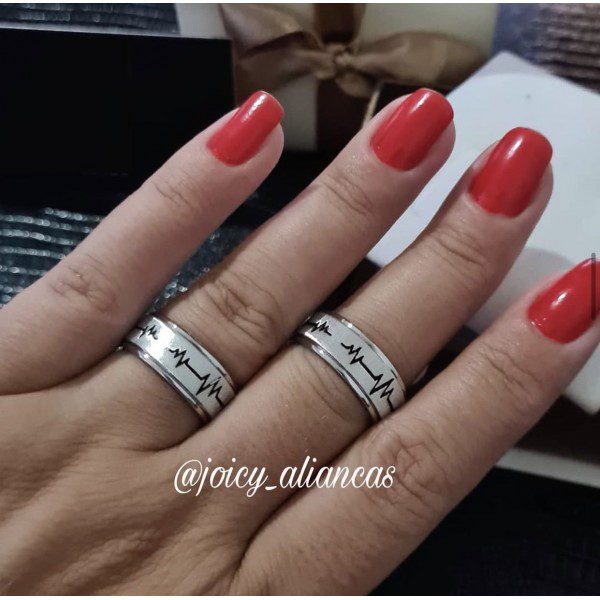 Par de alianças prata em aço cirúrgico 8mm com batimentos cardíacos fosco – Ideal para namoro, noivado e compromisso.
