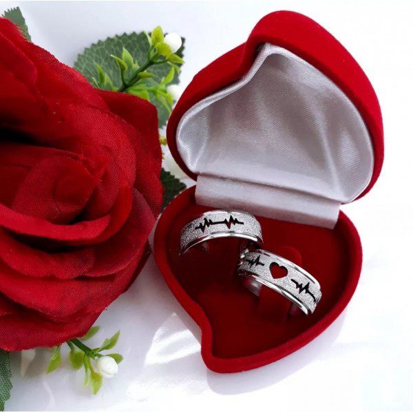 Par de alianças prata em aço cirúrgico 8mm diamantado com batimentos e c/coração vazado prata – Ideal para namoro, noivado e compromisso.
