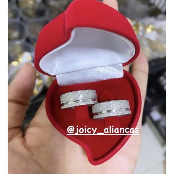 Par De Alianças Prata Em Aço Cirúrgico 8mm Diamantado Com Pedrinha Na Feminina