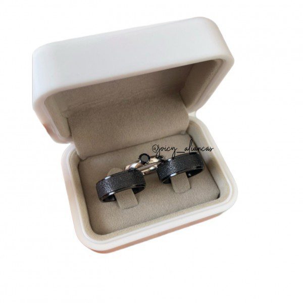 Par de alianças prata em aço cirúrgico 8mm diamantado preto Modelo Maia 02 – Ideal para namoro, noivado e compromisso.