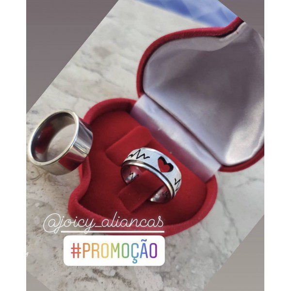 Par de alianças prata em aço cirúrgico 8mm fem c/coração e masc polido – Ideal para namoro, noivado e compromisso.