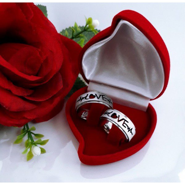 Par de alianças prata em aço cirúrgico 8mm fosco LOVE. – Ideal para namoro, noivado e compromisso.